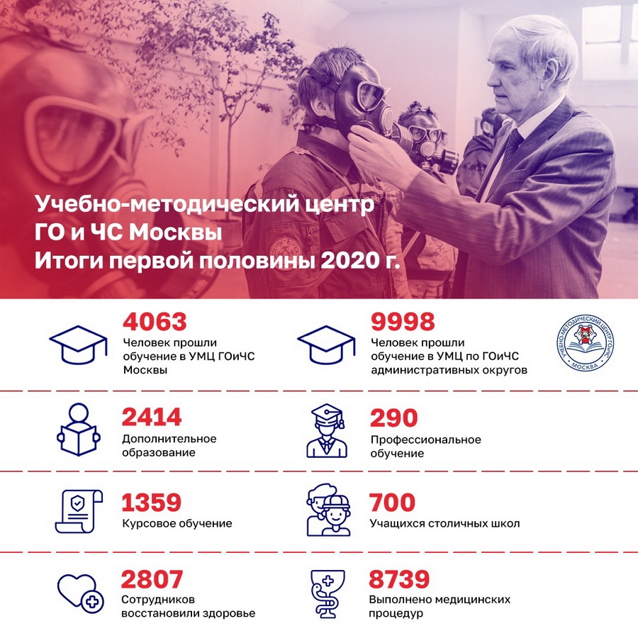 В первой половине 2020 года в Учебно-методическом центре по гражданской обороне и чрезвычайным ситуациям города Москвы подготовлено 14061 специалистов, а также прошли реабилитацию и восстановили здоровье 2807 сотрудников Департамента по делам гражданской обороны, чрезвычайным ситуациям и пожарной безопасности города Москвы.