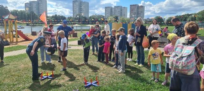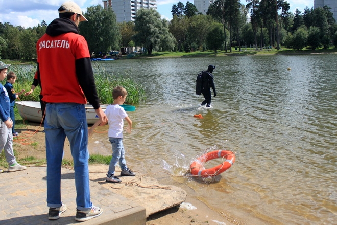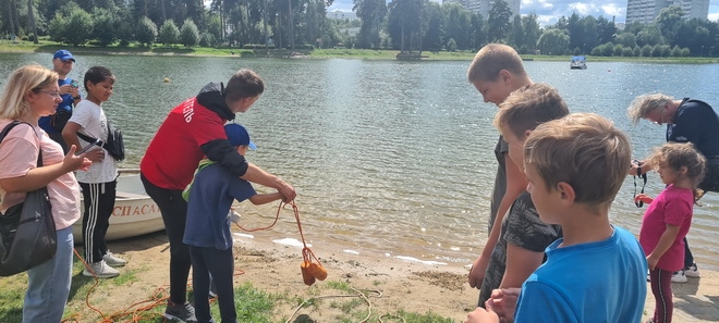 Сотрудники городской поисково-спасательной службы провели мастер-класс на берегу водоема, где участники могли научиться подавать средства спасения – конец Александрова и спасательный круг. А сотрудники ГБУЗ «ГКБ № 3 ДЗМ» провели лекцию и викторину о правилах оказания первой медицинской помощи.