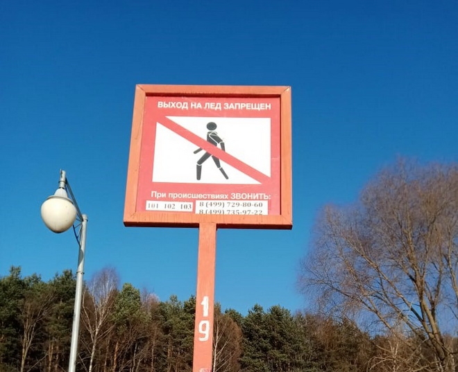 «Опасно выходить на лед в период неустойчивых температур. Толщина льда на водоеме не равномерна. Самый тонкий лед находится у берегов, в районе перекатов, стремнин, в местах слияния ручьев или их впадения в озеро, около вмерзших предметов, в местах слива в водоемы канализационных сточных вод».