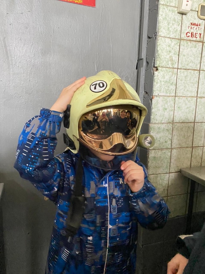 Огнеборцы продемонстрировали детям: как нужно быстро надевать на себя средства защиты: сапоги-брюки, куртку, рукавицы, каску, ремень. Рассказали, что одежда служит для защиты от воды, высокой температуры, травм при тушении пожаров, а пояс широкий с петлей «карабином», нужен для того, чтобы на нём можно прикрепиться, чтобы не упасть.